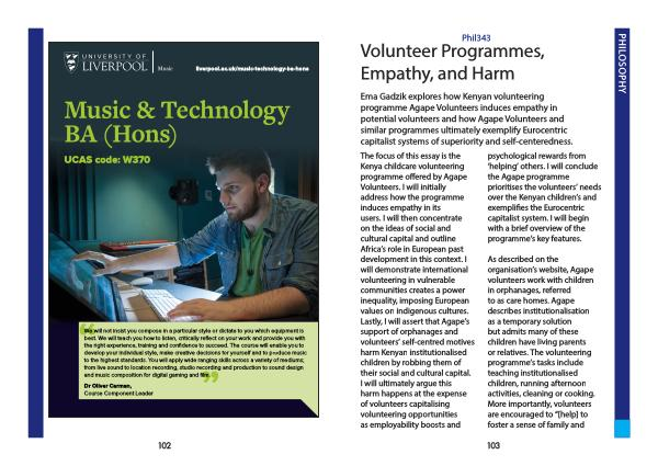 Ema Gadzik explores how Kenyan volunteering programme Agape Volunteers induces empathy in potential volunteers and how Agape Volunteers and similar programmes ultimately exemplify Eurocentric capitalist systems of superiority and self-centeredness .