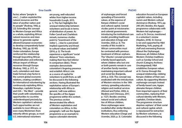 Phil343 of orphanages and forced spreading of Eurocentric values , at the expense of Kenyan children ’ s social and cultural capital . Several studies point at missionaries and colonial governments introducing the institutional care model , providing healthcare and education ( Chege and Ucembe , 2020 , p . 3 ). The novelty of this model in African communities must be contrasted with previous treatment of African orphans . The ‘ Ubuntu ’ concept promotes a family-based approach , where children who lost one or both parents remain in care of another family member , maintaining important cultural and social ties ( Kanjanda , 2014 , p . 333 ). This concept was eradicated with the introduction of Western missions in the 19th century , spreading education , religion and medical services ( Ahmed and Potter , 2006 , in Madziva and Chinouya , 2017 , p . 1127 ). Besides severing natural social and cultural ties of African children , these orphanages were modelled after similar Western institutions , thus enforcing Western education ( Chege and Ucembe , 2020 , p . 3 ). Colonialist education focused on European capitalist values , including racism and Western cultural dominance ( Rodney , 1972 , pp . 240-241 ). Besides , the Agape programme collaborates with Western-led orphanages – such as St . Dorcas , mentioned in a volunteer ’ s review ( Hayden , 2018 ). St . Dorcas is ran and supported by H & A Marketing , York , paying all staff and overseeing finances ( About the Orphanage ). Moreover , all children follow Western Christian traditions such as Sunday School and church ( Category Archives : Uncategorized ). H & A establishes European values at St . Dorcas through this unequal relationship , robbing Kenyan children of their own culture . By supporting Western orphanage concepts instead of family-based care , Agape alienates Kenyan children from important aspects of their communities , replacing their cultural identity with Western , capitalist , Christian ideals . The programme structure deprives orphans ’ of their social and cultural capital , which is repurposed for extraction by Western volunteers , as discussed in the following