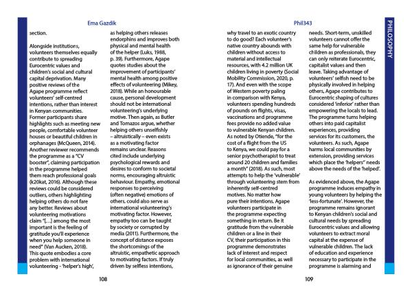 Alongside institutions , volunteers themselves equally contribute to spreading Eurocentric values and children ’ s social and cultural capital deprivation . Many positive reviews of the Agape programme reflect volunteers ’ self-centred intentions , rather than interest in Kenyan communities . Former participants share highlights such as meeting new people , comfortable volunteer houses or beautiful children in orphanages ( McQueen , 2014 ). Another reviewer recommends the programme as a “ CV booster ”, claiming participation in the programme helped them reach professional goals ( k20kat , 2016 ). Although these reviews could be considered outliers , others highlighting helping others do not fare any better . Reviews about volunteering motivations claim “[…] among the most important is the feeling of gratitude you ’ ll experience when you help someone in need ” ( Van Aucken , 2018 ). This quote embodies a core problem with international volunteering - ‘ helper ’ s high ’,