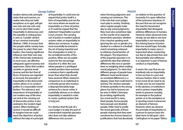 Phil239 when forming judgments and carrying out sentences . This is the role that court judges must play in society . Similarly , when regular people make day-to-day moral judgments , they must also sometimes take on the mantle of an impartial benevolent spectator , whether it be a teacher grading work ignoring the race or gender of a student or a referee in a football match remaining unbiased to arbitrary characteristics of the players . The importance of the impartial spectator is to uphold the idea that arbitrary differences like race or gender have no weighing when making moral judgments . To claim that different groups of people have different moral worth based on unrelated differences is a slippery slope that could lead to tyranny . The obvious example of where partiality in the wrong places has led to tyranny can be seen in Hitler ’ s Germany . By ascribing significantly less moral worth to Jews , black people , Roma people , homosexuals and disabled people , Hitler tried to justify the moral genocide of these people claiming that they were somehow less human based on justifications that had absolutely no relation to the question of humanity . It is upon reflection of the tyrannous injustices of the past that we can recognise the need for benevolent impartiality that disregards arbitrary differences in humans . However , when observed more closely , we are able to see how impartiality is not necessarily the shining beacon of justice that one would hope . Actually , impartiality in many cases is impractical when conducting our day-to-day private lives and that partiality and selfishness is as important a part of human conduct as impartiality .