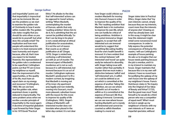 how Singer could criticise our modern Macbeth for moving into Duncan ’ s house in order to improve the quality of his life . This ‘ vaulting ambition ’ that Macbeth feels is his motivation to improve his own life , which one can hardly be critical of being ambitious . Ambition is not a priori immoral as Singer suggests , to accept that selfinterested acts are immoral would be to suggest that something like eating healthy food for one ’ s health benefit is immoral . It is here evident that the contrast between ‘ selfinterested ’ and ‘ moral ’ can quite easily be reduced to absurdity , with Singer taking issue with murder rather than partiality . It appears that we must make a distinction between ‘ selfish ’ and ‘ self-interested ’ acts . A selfish act could be defined as an act which is committed at the expense of another . Taking this definition , we can see where Macbeth ’ s act of murder is selfish as it is committed at the expense of Duncan ’ s life thus making it immoral . Conversely , we can see now where househunting Macbeth ’ s act is merely self-interested and cannot be counted as selfish therefore making it a moral act .