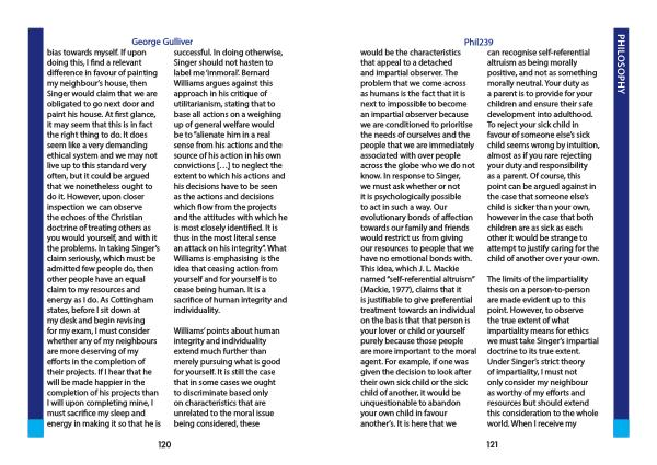 George Gulliver bias towards myself . If upon doing this , I find a relevant difference in favour of painting my neighbour ’ s house , then Singer would claim that we are obligated to go next door and paint his house . At first glance , it may seem that this is in fact the right thing to do . It does seem like a very demanding ethical system and we may not live up to this standard very often , but it could be argued that we nonetheless ought to do it . However , upon closer inspection we can observe the echoes of the Christian doctrine of treating others as you would yourself , and with it the problems . In taking Singer ’ s claim seriously , which must be admitted few people do , then other people have an equal claim to my resources and energy as I do . As Cottingham states , before I sit down at my desk and begin revising for my exam , I must consider whether any of my neighbours are more deserving of my efforts in the completion of their projects . If I hear that he will be made happier in the completion of his projects than I will upon completing mine , I must sacrifice my sleep and energy in making it so that he is