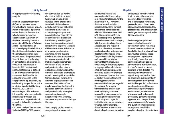 for financial return , and amateurism indicates doing something for pleasure , for the sheer love of it … However , these rather value-laden , popular distinctions conceal much more complex social relations ’ ( Zimmermann , 1995 , p . 1 ). Zimmermann refers to the intricate power dynamics woven between both concepts ; whilst professionals perform a recognised and required function of society , amateurs can be viewed as imitators and dabblers in their spare time . The professional is legitimised and valued in society by payment for their services ; contrastingly , the amateur pays to engage with such hobbies often through equipment or means to access . For example , a professional director functions as part of the entertainment industry ; their work is commoditised and packaged to the masses . An amateur filmmaker may imitate such work by buying a camera , researching cinematography , or taking film classes whilst functioning as a buyer for institutions to market products towards . In this example , the differences are overt ; the director holds power , expertise ,