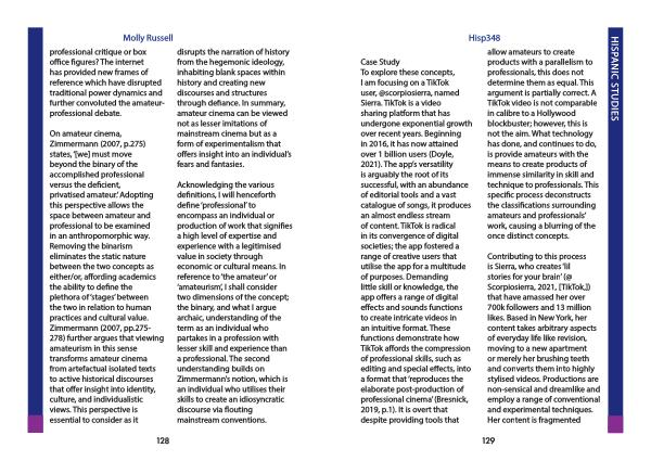 On amateur cinema , Zimmermann ( 2007 , p . 275 ) states , ‘[ we ] must move beyond the binary of the accomplished professional versus the deficient , privatised amateur .’ Adopting this perspective allows the space between amateur and professional to be examined in an anthropomorphic way . Removing the binarism eliminates the static nature between the two concepts as either / or , affording academics the ability to define the plethora of ‘ stages ’ between the two in relation to human practices and cultural value . Zimmermann ( 2007 , pp . 275- 278 ) further argues that viewing amateurism in this sense transforms amateur cinema from artefactual isolated texts to active historical discourses that offer insight into identity , culture , and individualistic views . This perspective is essential to consider as it