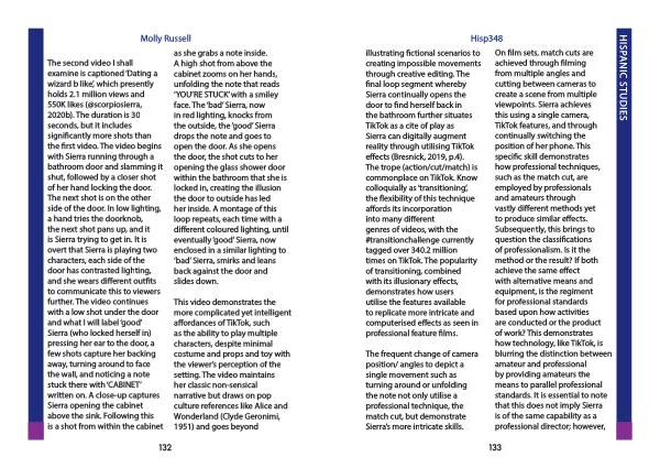 The second video I shall examine is captioned ‘ Dating a wizard b like ’, which presently holds 2.1 million views and 550K likes (@ scorpiosierra , 2020b ). The duration is 30 seconds , but it includes significantly more shots than the first video . The video begins with Sierra running through a bathroom door and slamming it shut , followed by a closer shot of her hand locking the door . The next shot is on the other side of the door . In low lighting , a hand tries the doorknob , the next shot pans up , and it is Sierra trying to get in . It is overt that Sierra is playing two characters , each side of the door has contrasted lighting , and she wears different outfits to communicate this to viewers further . The video continues with a low shot under the door and what I will label ‘ good ’ Sierra ( who locked herself in ) pressing her ear to the door , a few shots capture her backing away , turning around to face the wall , and noticing a note stuck there with ‘ CABINET ’ written on . A close-up captures Sierra opening the cabinet above the sink . Following this is a shot from within the cabinet