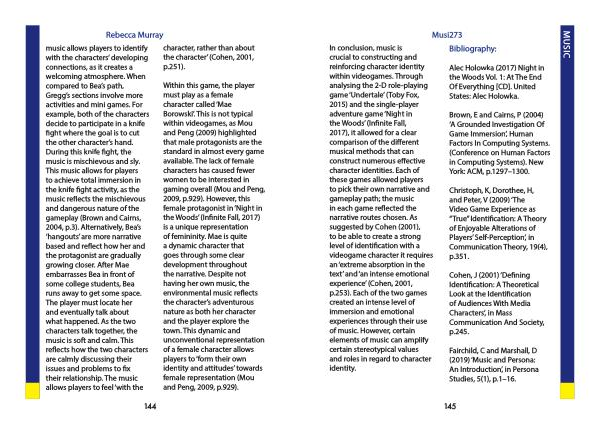 In conclusion , music is crucial to constructing and reinforcing character identity within videogames . Through analysing the 2-D role-playing game ‘ Undertale ’ ( Toby Fox , 2015 ) and the single-player adventure game ‘ Night in the Woods ’ ( Infinite Fall , 2017 ), it allowed for a clear comparison of the different musical methods that can construct numerous effective character identities . Each of these games allowed players to pick their own narrative and gameplay path ; the music in each game reflected the narrative routes chosen . As suggested by Cohen ( 2001 ), to be able to create a strong level of identification with a videogame character it requires an ‘ extreme absorption in the text ’ and ‘ an intense emotional experience ’ ( Cohen , 2001 , p . 253 ). Each of the two games created an intense level of immersion and emotional experiences through their use of music . However , certain elements of music can amplify certain stereotypical values and roles in regard to character identity .
