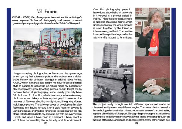This project really brought me into different spaces and made me observe the city from many different angles . The cover photo chosen for this anthology demonstrates this and represents some of the contrasting aspects of the fabric of Liverpool . Through the photographs in this project , I attempted to document the way I saw this fabric emerging through the makeup of the city ’ s landscape and people into the view of the human eye .