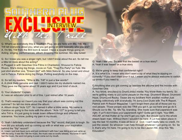 Q . Anything else you got coming up besides the albuma and the movies with Geechee One . A . You know , shoutsout to DrumLordsz media . You know thats my family . So we ' re getting ready to put some people on the map . Drumlord Shawt , Drumlord Haze , DrumLord Rocky . Those are my brothers from another mother . Just working collectively with everybody . I ' m sorry , Cool Dude with The R Report , Patrick with R Report Magazine . I can ' t forget them plus all of those are my root people . Those people was like TRill you got it , go out here and go do it . Shouts out to Ms . Tip . Ms Tip , branding . She made sure that paperwork was right . If ya '' ll don ' t have your papwrwork right ? Gotta get it right . Your BMI , ASCAP , all that . Holler at Tip she '' ll get you right . But shouts out to the whole dream team man . Without them I wouldn ' t be here . A Lot has taken place in say the last 10 months . It was all favor of God . I can ' t really take no credit , I ' m just the vessel . So whoever I can help through whatever I got going on . So be it , that ' s why I ' m here . I ' m going to try to be like Lauren Hill , drop this " Ms . Education ".