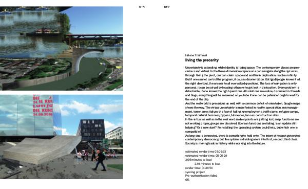 Uncertainty is extending, while identity is losing space. The contemporary places are precarious and virtual. In the three-dimensional space one can navigate along the xyz-axes, through fixing the pivot, one can claim space and and finite duplication reaches infinity. But if one cannot control the program, it causes disorientation. But( god) google knows it all, the right shortcut, the answer to all ever asked questions. The loss of navigation is only personal, it can be solved by locating others who got lost in dislocation. Every problem is detachable, if one knows the right questions. All solutions are online, discussed in threads and blogs, everything will be answered on youtube if one can be patient enough to wait for the end of the clip. And the real world is precarious as well, with a common deficit of orientation. Google maps shows the way. The virtual uncertainty is manifested in reality: speculation, mismanagement, terror, error, failure, the fear of failing, unemployment, traffic jams, refugee camps, temporal cultural business, bypass, blockades, fences: construction sites. In the virtual as well as in the real word anchor points are getting lost, snap functions are not working proper, groups are dissolved, Boolean functions are failing. Is an update still helping? Or a new start? Reinstalling the operating system could help, but which one is compatible? As long one is connected, there is something to hold onto. The internet hotspot generates contemporary democracy, but the system is dividing users into first, second, third class. Society is moving back in history while working into the future.