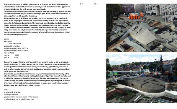 Then one is happy not to fall into cyber space at all. There is still distance between the virtual and real world that human cannot exceed yet. In that orbit one can find gaps for exchange; virtual ones: the void, and real ones: wastelands. On wastelands initiators and noobs meet to fight for their right of identity, while in the void collaboration find new ways of expression through open sources and shared commons. In some gaps there is still space for democracy. Its just getting hard to find those spaces when structures get overruled by neo-liberal terror. When keeping the city scape in a constant precarity its citizen are exposed to a steady level of stress and uncertainty. All movements are ordered by guardrails and safety fences, free space is limited, living gets temporary, unadjusted actions are inaccessible. Similar happens in the virtual world: programs make workers dependent, companies overruling possibilities not only to control the market but to regulate creativity. One cannot deny an update, the possibilities of choice got rather small but advertisement and system are still pretending the opposite.