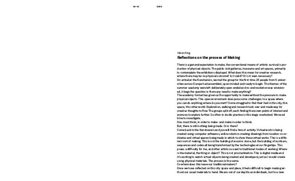 There is a general expectation to make; the conventional means of artistic survival is production of physical objects. The public visit galleries, museums and art spaces, primarily to contemplate the exhibitions displayed. What does this mean for creative research, where there may be no physical outcome? Is it valid? Or is it even necessary? On arrival at the Kunstverein, we met the group for the first time. 25 people from 5 universities across Europe had assembled, open minded and ready to begin. The themes of the summer academy were left deliberately open ended and no end resolution was envisioned, it begs the question is there any need to make anything? The academy format has given us the opportunity to make without the pressure to make physical objects. This open environment does pose some challenges. In a space where you can do anything, where do you start? Some struggled to find their feet in this city, this space, this other world. Exploration, walking and research took over and made way for creative thoughts to flow. The groups split off, each finding there own points of interest and avenues to explore further. So often in studio practice is this stage overlooked. We need time to investigate. One must think, in order to make- and make in order to think. But, there is still nothing being made. Or is there? Come back to the Kunstverein and you will find a hive of activity. Virtual work is being created using computer softwares, ardino robotics creating drawings from location co-ordinates and virtual spaces being made in which to show these virtual works. This is a different sort of making. This is not the building of wood or stone, but the building of numbers, sequences and codes all being transformed by the technologies at our fingertips. This poses a difficulty for me, and other artists so used to traditional modes of working. Where is the material, the thing or object? This is not procrastination. This is digital media and it‘ s exciting to watch virtual objects being created and developed, just as I would create using physical materials. The process is the same. So where does this leave our traditional makers? Once we have reflected on this city space and place, it feels difficult to begin making without our usual materials to hand. We are out of our depths as individuals, lost to a new