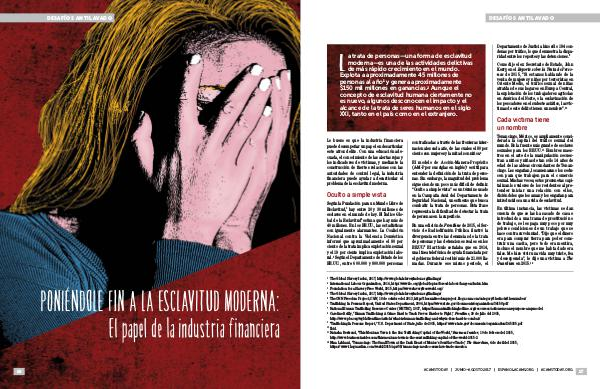 DESAFÍOS ANTILAVADO a trata de personas— una forma de esclavitud moderna— es una de las actividades delictivas de más rápido crecimiento en el mundo. Explota a aproximadamente 45 millones de personas al año 1 y genera aproximadamente $ 150 mil millones en ganancias. 2 Aunque el concepto de esclavitud humana ciertamente no es nuevo, algunos desconocen el impacto y el alcance de la trata de seres humanos en el siglo XXI, tanto en el país como en el extranjero.