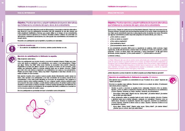 Después de enseñar varios ejercicios puede ser útil ensayarlos o hacer algunos ejercicios alternativos , para discernir lo que los participantes encuentren más útil . Asegúrese de que ellos sientan que están adquiriendo habilidades y técnicas que pueden utilizar en su trabajo con las sobrevivientes , y que pueden hacer los ejercicios por sí mismos . Necesitan sentirse confiados de poder lidiar con detonadores y sentimientos abrumadores ; de poder ayudar a las sobrevivientes a reconectarse con el aquí y ahora .