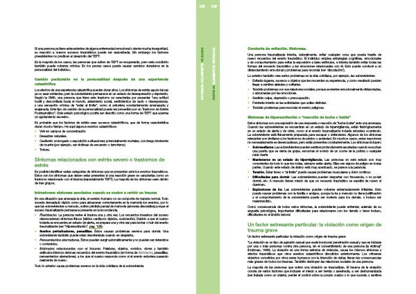 • Flashbacks . La persona revive el trauma una y otra vez . Los recuerdos invasivos del suceso desencadenan síntomas físicos ( latidos cardíacos rápidos , sudoración ). Debido a que el cuerpo todavía se encuentra en estado de alerta , se prepara una y otra vez para luchar o huir del evento traumatizante ( ver “ Hiperexcitación ”, pag . 126 ).
