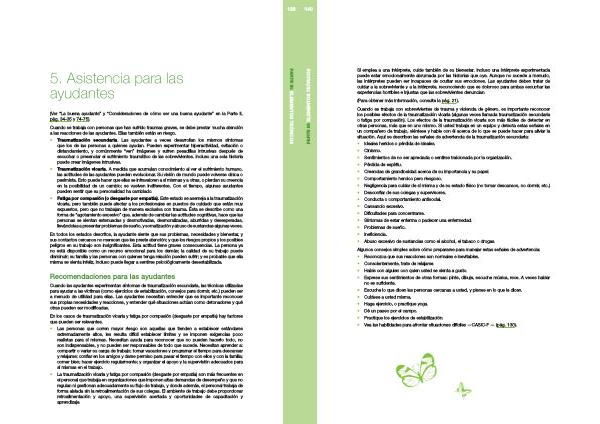 • Traumatización secundaria . Las ayudantes a veces desarrollan los mismos síntomas que los de las personas a quienes ayudan . Pueden experimentar hiperactividad , evitación o distanciamiento , y comúnmente “ ven ” imágenes y sufren pesadillas intrusivas después de escuchar o presenciar el sufrimiento traumático de las sobrevivientes . Incluso una sola historia puede crear imágenes intrusivas .