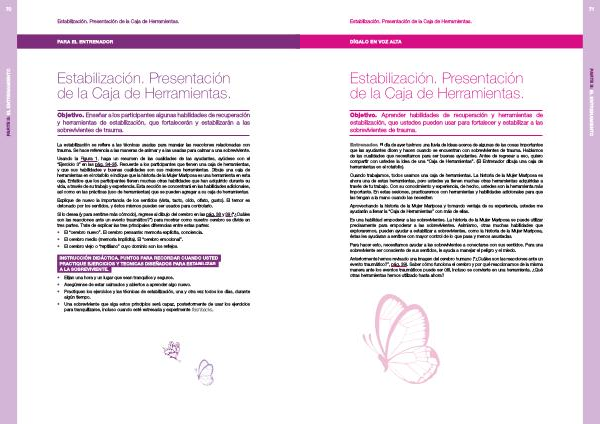 Objetivo . Enseñar a los participantes algunas habilidades de recuperación y herramientas de estabilización , que fortalecerán y estabilizarán a las sobrevivientes de trauma .