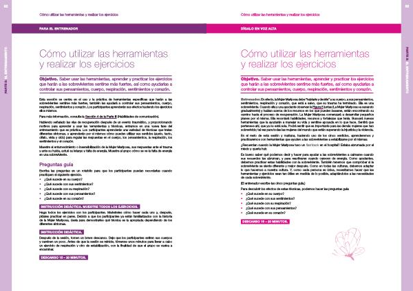 Esta sección se centra en el uso y la práctica de herramientas específicas que harán a las sobrevivientes sentirse más fuertes , también las ayudará a controlar sus pensamientos , cuerpo , respiración , sentimientos y corazón . Los participantes aprenderán sus efectos haciendo los ejercicios ellos mismos .