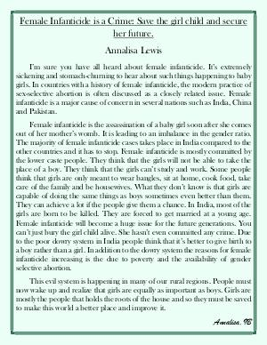 other countries and it has to stop. Female infanticide is mostly committed by