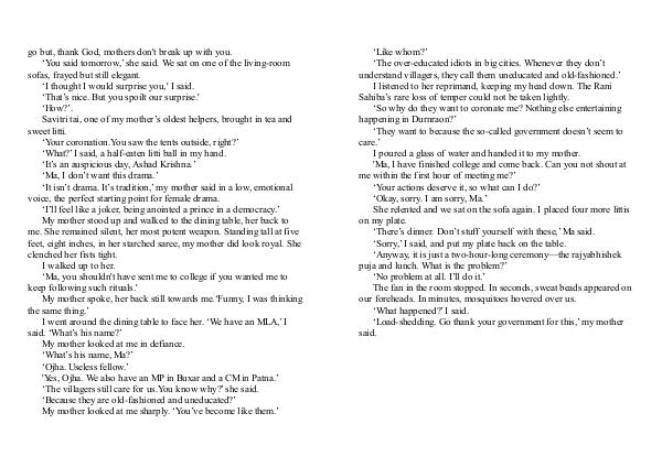 go but, thank God, mothers don ' t break up with you.‘ You said tomorrow,’ she said. We sat on one of the living-room sofas, frayed but still elegant.‘ I thought I would surprise you,' I said.‘ That’ s nice. But you spoilt our surprise.'‘ How?’. Savitri tai, one of my mother’ s oldest helpers, brought in tea and sweet litti.‘ Your coronation. You saw the tents outside, right?’‘ What?’ I said, a half-eaten litti ball in my hand.‘ It’ s an auspicious day, Ashad Krishna.’‘ Ma, I don’ t want this drama.’‘ It isn’ t drama. It’ s tradition,’ my mother said in a low, emotional voice, the perfect starting point for female drama.‘ I’ ll feel like a joker, being anointed a prince in a democracy.’ My mother stood up and walked to the dining table, her back to me. She remained silent, her most potent weapon. Standing tall at five feet, eight inches, in her starched saree, my mother did look royal. She clenched her fists tight. I walked up to her.‘ Ma, you shouldn ' t have sent me to college if you wanted me to keep following such rituals.' My mother spoke, her back still towards me.‘ Funny, I was thinking the same thing.’ I went around the dining table to face her.‘ We have an MLA,’ I said.‘ What’ s his name?’ My mother looked at me in defiance.‘ What’ s his name, Ma?’‘ Ojha. Useless fellow.’ ' Yes, Ojha. We also have an MP in Buxar and a CM in Patna.’‘ The villagers still care for us. You know why?’ she said.‘ Because they are old-fashioned and uneducated?’ My mother looked at me sharply.‘ You’ ve become like them.’
