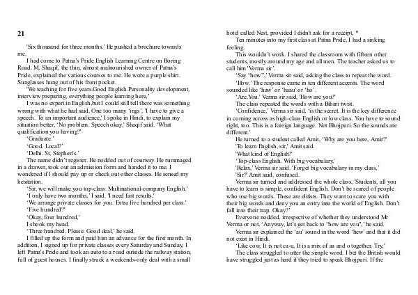 hotel called Nest, provided I didn ' t ask for a receipt, * Ten minutes into my first class at Patna Pride, I had a sinking feeling. This wouldn’ t work. I shared the classroom with fifteen other students, mostly around my age and all men. The teacher asked us to call him ' Verma sir’.‘ Say“ how”,’ Verma sir said, asking the class to repeat the word.‘ How.’ The response came in ten different accents. The word sounded like‘ haw’ or‘ haau’ or‘ ho’.‘ Are. You.' Verma sir said, ' How are you?' The class repeated the words with a Bihari twist.‘ Confidence,’ Verma sir said,‘ is the secret. It is the key difference in coming across as high-class English or low class. You have to sound right, too. This is a foreign language. Not Bhojpuri. So the sounds are different.' He turned to a student called Amit,‘ Why are you here, Amir?' ' To learn English, sir,' Amit said. ' What kind of English?'‘ Top-class English. With big vocabulary,' ' Relax,' Verma sir said. ' Forget big vocabulary in my class,’ ' Sir?' Amit said, confused. Verma sir turned and addressed the whole class, ' Students, all you have to learn is simple, confident English. Don’ t be scared of people who use big words. These are elitists. They want to scare you with their big words and deny you an entry into the world of English. Don’ t fall into their trap. Okay?’