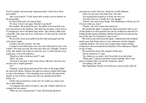 I’ ll come with you, okay?’‘ Thanks,’ she said. I guess that meant yes. We reached the ghats. I clasped her hand and held it until we got off the plank on to firm ground. The old me would have asked her if holding hands meant something. But the old me had screwed up big time in the past. So I decided to‘ play it cool’.