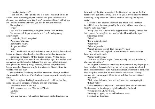 ‘ Sit up,’ she said. She sat cross-legged on the charpoy. I faced her, but I moved far enough so she wouldn’ t feel I could strike again. She smiled at me.‘ What?’‘ It was nice,’ she said.‘ What was?’‘ What we just did.’‘ We sat up cross-legged. That was nice?’ I said.‘ Yes,’ she said and laughed.‘ It was wonderful how we sat up.