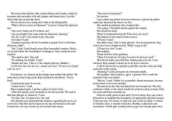 ‘ Yes,’ I said. I had already given Riya Samantha’ s number. Riya ' s car would follow the Foundation’ s contingent. They would all come together.‘ The salad is nice,’ she said.‘ It’ s nothing. So simple,’ I said.‘ Simple and nice. I like it. I like simple and nice, Madhav.’ Is that how she sees me too— simple and nice? Or am I too simple and too nice? *