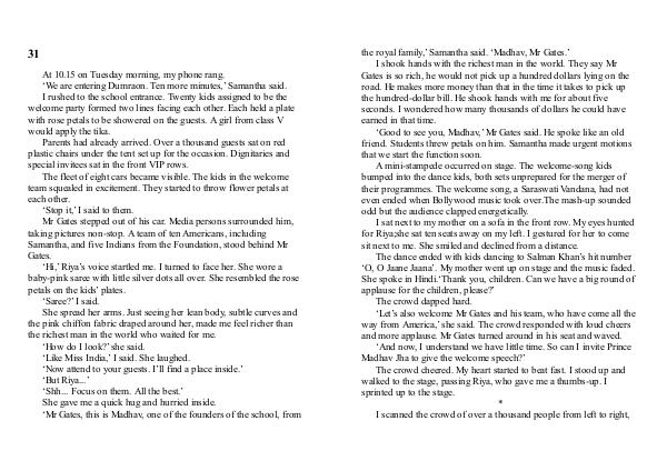 ‘ Hi,’ Riya’ s voice startled me. I turned to face her. She wore a baby-pink saree with little silver dots all over. She resembled the rose petals on the kids’ plates.‘ Saree?’ I said. She spread her arms. Just seeing her lean body, subtle curves and the pink chiffon fabric draped around her, made me feel richer than the richest man in the world who waited for me.‘ How do I look?’ she said.‘ Like Miss India,’ I said. She laughed.‘ Now attend to your guests. I’ ll find a place inside.’‘ But Riya...’‘ Shh... Focus on them. All the best.’ She gave me a quick hug and hurried inside.‘ Mr Gates, this is Madhav, one of the founders of the school, from