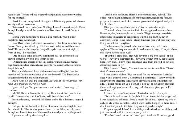 ‘ And in this backward Bihar is this extraordinary school. This school with seven hundred kids, three teachers, negligible fees, no proper classrooms, no toilets, no real government support and yet, a lot of riches.’ Riya gave me two thumbs-ups. Okay, no mistakes so far.‘ The real riches here are the kids. I am supposed to teach them. However, they have taught me so much. We grown-ups complain about what is lacking in this school, But these kids, they never complain. Come to our school at any time and you will hear only one thing from them— laughter.’