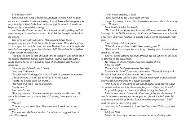 17 February 2009 Sometimes you need a knock on the head to come hack to your senses. I received it hard knock today. I don’ t know what happened to me yesterday. I kissed Madhav on the roof of his haveli. It made me forget reality. I started dreaming.