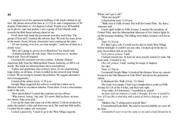 Where can I get a cab?’ ' Want one myself.’ I checked the time: 11.25 p. m.‘ Walk west to Fifth Avenue. You will hit Central Park. Try there,’ someone said. I took rapid strides to Fifth Avenue. I reached the periphery of Central Park, near the Metropolitan Museum of Art. Amber lights lit up the museum building. The falling snowflakes created a soft-focus effect. Time: 11.31 p. m. If I didn’ t get a cab, I would not be able to reach West Village before midnight. I couldn’ t see any cabs. I looked up at the sky to pray. Snowflakes fell on my face. God, please, please, I said. I looked around me. At least six more people waited for cabs. My heart sank. I wanted to cry. One cab, please, I said, waiting for magic to happen. No cabs. Time: 11.34 p. m. I reopened Google Maps. I checked the distance from my current location at the Met Museum to Cafe Wha? and chose the pedestrian option. It displayed this: Walk 4.0 mi, 1 h 10min The route was simple. I had to go straight down south on Fifth