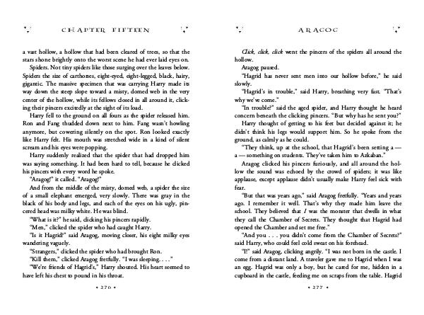 Spiders. Not tiny spiders like those surging over the leaves below. Spiders the size of carthorses, eight-eyed, eight-legged, black, hairy, gigantic. The massive specimen that was carrying Harry made its way down the steep slope toward a misty, domed web in the very center of the hollow, while its fellows closed in all around it, clicking their pincers excitedly at the sight of its load.