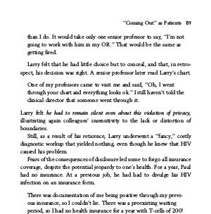 Fears of the consequences of disclosure led some to forgo all insurance coverage, despite the potential jeopardy to one’ s health. For a year, Paul had no insurance. At a previous job, he had had to divulge his HIV infection on an insurance form.