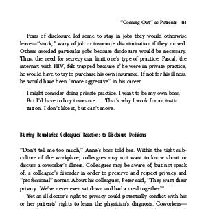 ‘‘ Don’ t tell me too much,’’ Anne’ s boss told her. Within the tight subculture of the workplace, colleagues may not want to know about or discuss a coworker’ s illness. Colleagues may be aware of, but not speak of, a colleague’ s disorder in order to preserve and respect privacy and‘‘ professional’’ norms. About his colleagues, Peter said,‘‘ They want their privacy. We’ ve never even sat down and had a meal together!’’