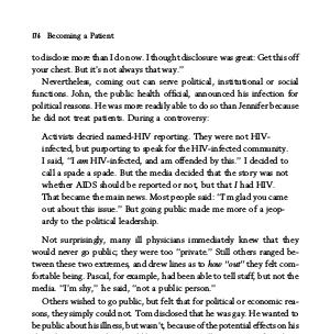 Nevertheless, coming out can serve political, institutional or social functions. John, the public health official, announced his infection for political reasons. He was more readily able to do so than Jennifer because he did not treat patients. During a controversy:
