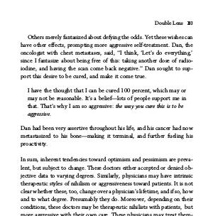 Others merely fantasized about defying the odds. Yet these wishes can have other effects, prompting more aggressive self-treatment. Dan, the oncologist with chest metastases, said,‘‘ I think,‘ Let’ s do everything,’ since I fantasize about being free of this: taking another dose of radioiodine, and having the scan come back negative.’’ Dan sought to support this desire to be cured, and make it come true.
