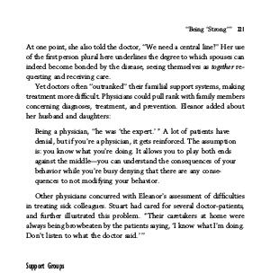 These physician-patients found it hard not only to draw on family support, but also to participate in support groups. Generally, these groups contained nonphysicians, and many doctors did not join because of not wanting to have to disclose their illness. Rumors about an ill physician could spread. Awkwardness arose, too, from being‘‘ the physician’’ in the room, and being asked medical questions. Suzanne said,‘‘ I went to a group, but was the most functional person there. They asked me tons of questions. It just got to be a pain in the ass.’’ As a result of these obstacles, these physicians had fewer resources to rely on.