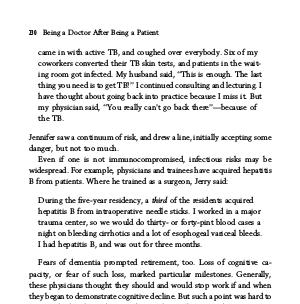came in with active TB, and coughed over everybody. Six of my coworkers converted their TB skin tests, and patients in the waiting room got infected. My husband said,‘‘ This is enough. The last thing you need is to get TB!’’ I continued consulting and lecturing. I have thought about going back into practice because I miss it. But my physician said,‘‘ You really can’ t go back there’’— because of the TB.