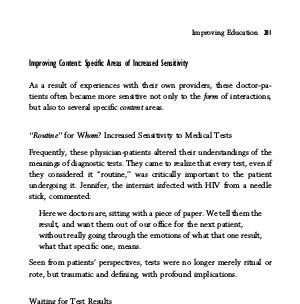 Frequently, these physician-patients altered their understandings of the meanings of diagnostic tests. They came to realize that every test, even if they considered it‘‘ routine,’’ was critically important to the patient undergoing it. Jennifer, the internist infected with HIV from a needle stick, commented: