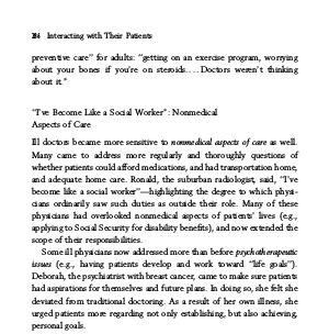Ill doctors became more sensitive to nonmedical aspects of care as well. Many came to address more regularly and thoroughly questions of whether patients could afford medications, and had transportation home, and adequate home care. Ronald, the suburban radiologist, said,‘‘ I’ ve become like a social worker’’— highlighting the degree to which physicians ordinarily saw such duties as outside their role. Many of these physicians had overlooked nonmedical aspects of patients’ lives( e. g., applying to Social Security for disability benefits), and now extended the scope of their responsibilities.