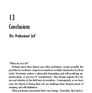 Perhaps more than almost any other profession, except possibly the priesthood, medicine compels its members to define themselves by their work. Novitiates endure a physically demanding and self-sacrificing apprenticeship, or process of‘‘ socialization,’’ that deeply ingrains the values and identity of the field into its members. Consequently, as we have seen, the threat of losing their job can challenge their deepest senses of meaning and self-definition.
