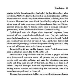 starting to light Sabbath candles; Charles left the Republican Party after developing AIDS. Bradley was the son of an academic physician, and thus more committed than he may have otherwise been to helping those less fortunate. He started out more liberal than Charles, and grew up with a strong sense of social conscience, yet illness changed him, too. His depression prompted him to become more open to younger colleagues’ perspectives, and to less biomedical forms of spiritual healing.