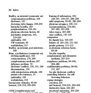 Brian, a pediatrician( comments on) clothing significance, 102 communication, 278, 280 complementary medicine, 207 deference problem, 76 disclosure conflicts, 150, 151, 166 discrimination, 130 odds interpretation attitude, 198 patient role resistance, 31 spirituality, 242 workaholism, 218 bureaucratic obstacles, 85 – 90 burnout, 218 – 219, 293 – 294