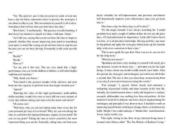 " As I told you, saying that you do not have the time to improve yourself, whether this means improving your mind or nourishing your spirit, is much like saying you do not have time to stop for gas because you are too busy driving. Eventually it will catch up with you." " Really?" " Really." " How so?" " Let me put it this way. You are very much like a highperformance race car worth millions of dollars; a well-oiled, highly sophisticated machine." " Why thank you Julian." " Your mind is the greatest wonder of the universe and your body has the capacity to perform feats that might astonish you." " Agreed." " Knowing the value of this high performance multi-million dollar machine, would it be wise to run it full out every minute of every day without taking a pit stop to let the motor cool down?" " Of course not." " Well then, why are you not taking some time every day for your personal pit stop or rest break? Why are you not taking the time to cool down the high performance engine of your mind? Do you see my point? Taking the time to renew yourself is the most important thing you can do. Ironically, taking time out from your