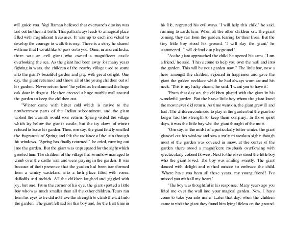 " As the giant approached the child, he opened his arms. ' I am a friend,' he said. ' I have come to help you over the wall and into the garden. This will be your garden now.'" The little boy, now a hero amongst the children, rejoiced in happiness and gave the giant the golden necklace which he had always worn around his neck. ' This is my lucky charm,' he said. ' I want you to have it.'