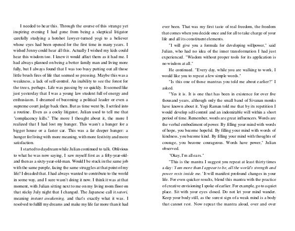 " Yes it is. It is one that has been in existence for over five thousand years, although only the small band of Sivanan monks have known about it. Yogi Raman told me that by its repetition I would develop self-control and an indomitable will within a short period of time. Remember, words are great influencers. Words are the verbal embodiment of power. By filling your mind with words of hope, you become hopeful. By filling your mind with words of kindness, you become kind. By filling your mind with thoughts of courage, you become courageous. Words have power," Julian observed. " Okay, I ' m all ears." " This is the mantra I suggest you repeat at least thirty times a day: ' I am more than I appear to be, all the world ' s strength and power rests inside me.' It will manifest profound changes in your life. For even quicker results, blend this mantra with the practice of creative envisioning I spoke of earlier. For example, go to a quiet place. Sit with your eyes closed. Do not let your mind wander. Keep your body still, as the surest sign of a weak mind is a body that cannot rest. Now repeat the mantra aloud, over and over