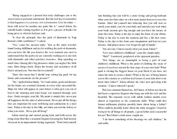 " No," replied Julian firmly. " As I said earlier, goals and dreams for the future are essential elements in every truly successful life. Hope for what will appear in your future is what gets you out of bed in the morning and what keeps you inspired through your days. Goals energize your life. My point is simply this: never put off happiness for the sake of achievement. Never put off the things that are important for your well-being and satisfaction to a later time. Today is the day to live fully, not when you win the lottery or when you retire. Never put off living!"