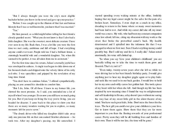 " Even today, twenty-seven years after she left us while we were driving her to her best friend ' s birthday party, I would give anything just to hear my daughter giggle again or to play hideand-seek like we used to in our back garden. I would love to hold her in my arms and softly caress her golden hair. She took a piece of my heart with her when she left. And though my life has been inspired by new meaning since I found the way to enlightenment and self-leadership in Sivana, a day doesn ' t pass without me seeing the rosy face of my sweet little girl in the silent theatre of my mind. You have such great kids, John. Don ' t miss the forest for the trees. The best gift you could ever give your children is your love. Get to know them again. Show them that they are far more important to you than the fleeting rewards of your professional career. Pretty soon they will be off, building lives and families of their own. Then it will be too late, the time will be gone."