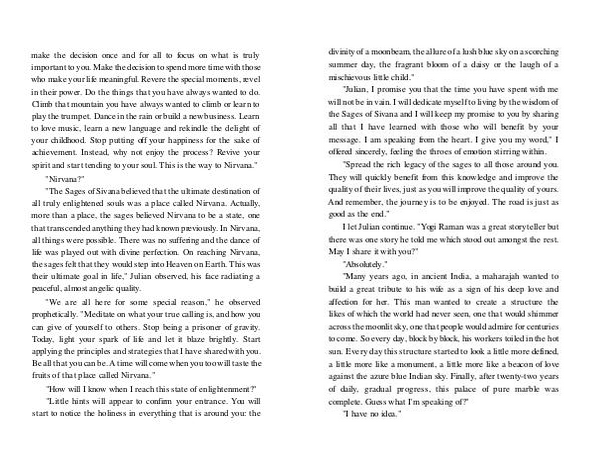 make the decision once and for all to focus on what is truly important to you. Make the decision to spend more time with those who make your life meaningful. Revere the special moments, revel in their power. Do the things that you have always wanted to do. Climb that mountain you have always wanted to climb or learn to play the trumpet. Dance in the rain or build a new business. Learn to love music, learn a new language and rekindle the delight of your childhood. Stop putting off your happiness for the sake of achievement. Instead, why not enjoy the process? Revive your spirit and start tending to your soul. This is the way to Nirvana." " Nirvana?" " The Sages of Sivana believed that the ultimate destination of all truly enlightened souls was a place called Nirvana. Actually, more than a place, the sages believed Nirvana to be a state, one that transcended anything they had known previously. In Nirvana, all things were possible. There was no suffering and the dance of life was played out with divine perfection. On reaching Nirvana, the sages felt that they would step into Heaven on Earth. This was their ultimate goal in life," Julian observed, his face radiating a peaceful, almost angelic quality.