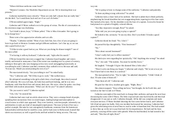 O’ Brien formed the men into a ragged line. Catherine heard laughter and voices nearby and turned in annoyance. One of the extras was standing next to a piece of scenery, talking to three girls who were hanging on his every word and giggling hysterically at everything he said. Catherine watched a moment, then walked over to the man and said,“ Excuse me. Would you mind joining the rest of us?”